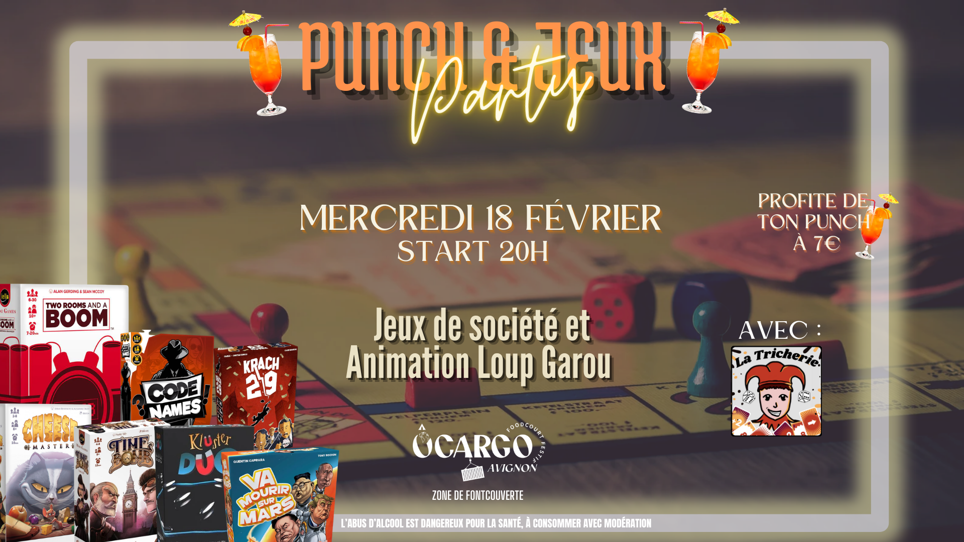 🎲SOIRÉE JEUX🎲 Venez vous retrouver entre amis ou en famille autour d'un bon jeu de société ! En partenariat avec « La Tricherie ».🎲 Profitez d’une multitude de jeux de société (Time’s Up, Jungle Speed, Twister et bien d’autres) et d’une animation Loup Garou. 😋 |