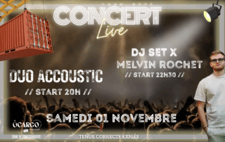 🎸 SOIRÉE CONCERT LIVE & DJ 🎧 Préparez-vous pour une soirée inoubliable ! Ce soir, rejoignez-nous dès 20h pour un Concert Live avec le groupe DUO ACOUSTIC, un groupe pop-rock énergique qui va enflammer la scène ! 🎶🔥 Ensuite, à partir de 22h30, laissez-vous emporter par les beats dynamiques de DJ MELVIN ROCHET pour une DJ Party mémorable ! 💃🕺 Rassemblez vos amis et vivez une soirée pleine de musique, de danse et de bonne humeur ! 🎵🎉 Et n’oubliez pas, tenue correcte exigée ! 👕