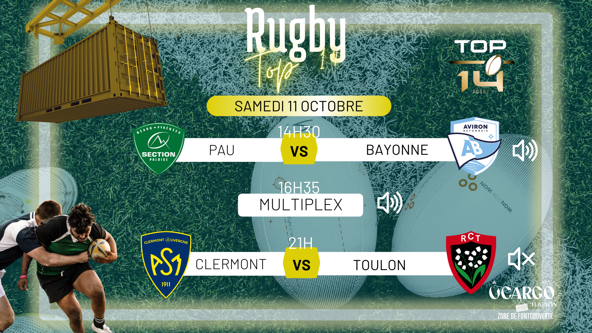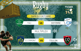 TOP 14Ne manquez pas le choc du Top 14 ! PAU - BAYONNE à 14h30 ( avec le son )LE MULTIPLEX à 16h35 ( avec le son )CLERMONT- TOULON à 21h ( sans le son )Nous diffusons le match sur grand écran pour que vous puissiez suivre chaque action dans une ambiance de folie ! Venez encourager votre équipe dans une atmosphère festive et conviviale À ce soir !