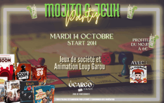 SOIRÉE JEUX & MOJITOVenez vous retrouver entre amis ou en famille autour d’un bon jeu de société !En partenariat avec « LA TRICHERIE».Profitez d’une multitude de jeux de société (Loup garou de thiercelieux, Time bomb, Two room and a boom, Kluster… ) et d’une animation Loup Garou. Et comme chaque mardi, profitez du mojito à 6€ pour vous accompagner !