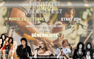 SOIRÉE BLIND TEST & MOJITO Fans de musique, cette soirée est faite pour vous ! Venez tester vos connaissances et vous ambiancer sur les plus grands hits toutes générations confondues à travers un blind test interactif. Saurez-vous reconnaître les titres dès les premières notes ? Pensez à venir avec votre téléphone bien chargé , il vous sera indispensable pour participer !Un moment fun, musical et plein de challenge vous attend… Qui sera le grand champion de la soirée ? À vous de jouer ! Et pour couronner le tout, comme chaque mardi, profitez de nos mojitos à 6€ ! À ce soir !