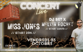 🎸 SOIRÉE CONCERT LIVE & DJ 🎧 Préparez-vous pour une soirée inoubliable ! Ce soir, rejoignez-nous dès 20h pour un Concert Live avec le groupe MISS JONES, un groupe pop-rock énergique qui va enflammer la scène ! 🎶🔥 Ensuite, à partir de 22h30, laissez-vous emporter par les beats dynamiques de DJ MELVIN ROCHET pour une DJ Party mémorable ! 💃🕺 Rassemblez vos amis et vivez une soirée pleine de musique, de danse et de bonne humeur ! 🎵🎉 Et n’oubliez pas, tenue correcte exigée ! 👕