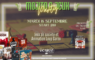 SOIRÉE JEUX & MOJITO Venez vous retrouver entre amis ou en famille autour d'un bon jeu de société ! En partenariat avec « LA TRICHERIE». Profitez d’une multitude de jeux de société (Loup garou de thiercelieux, Time bomb, Two room and a boom, Kluster... ) et d’une animation Loup Garou. Et comme chaque mardi, profitez du mojito à 6€ pour vous accompagner ! À ce soir !