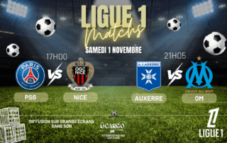 ⚽ LIGUE 1 ⚽ Ne manquez pas le choc PSG - Nice à 17h et OM - Auxerre à 21h05 ! 🎉 Nous diffusons le match sur grand écran intérieur et extérieur pour que vous puissiez suivre chaque action dans une ambiance de folie ! 📺🌟 Venez encourager votre équipe dans une atmosphère festive et conviviale. 🍔FOOD - BAR🍸