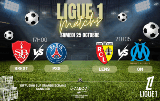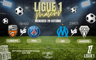 ⚽ LIGUE 1 ⚽ Ne manquez pas le choc entre Lorient - PSG à 19h et OM - Angers à 21h05 ! 🎉 Nous diffusons le match sur grand écran intérieur et extérieur pour que vous puissiez suivre chaque action dans une ambiance de folie ! 📺🌟 Venez encourager votre équipe dans une atmosphère festive et conviviale. 🍔FOOD - BAR🍸