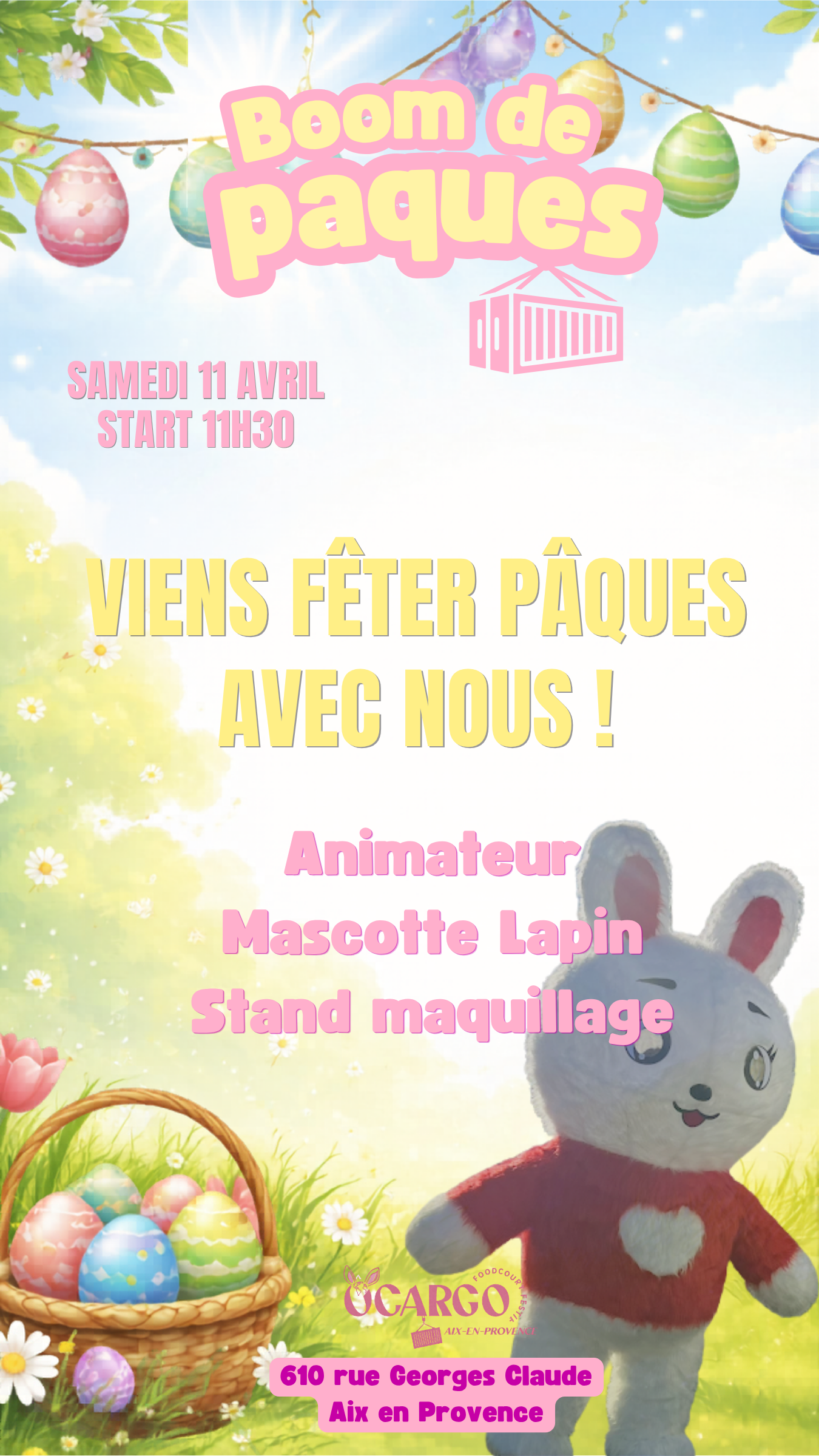 🐰 BOUM DE PÂQUES 🐰 Préparez-vous pour une journée pleine de surprises et de bonne humeur ! 🎉 Ce samedi, rejoignez nous dès 11h pour notre Boum de Pâques spéciale enfants et familles ! 🌟 Au programme :🎨 Stand de maquillage pour devenir votre personnage préféré🐾 Mascotte pour des photos et câlins mémorables🎤 Animateur pour [...] |