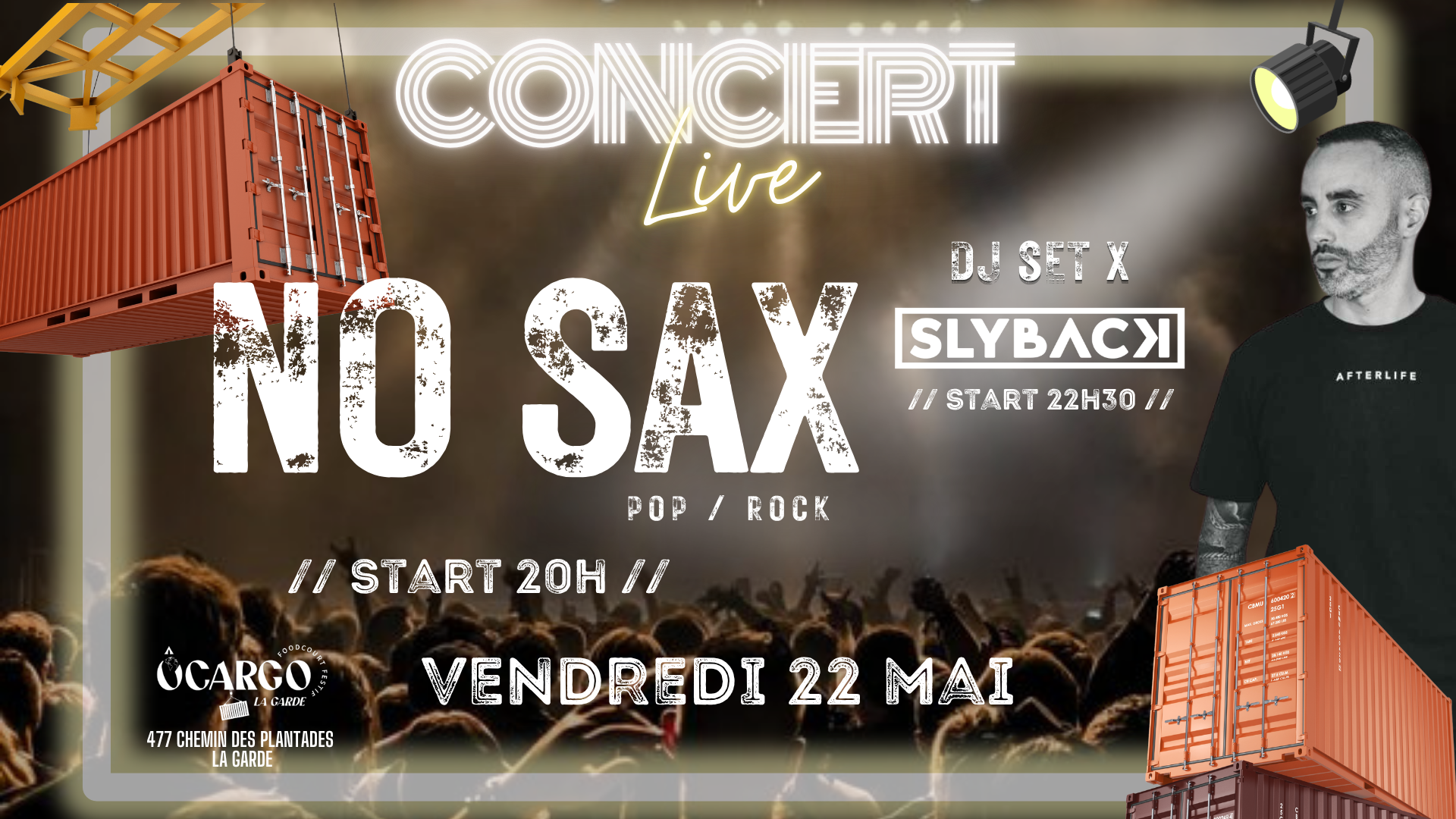 La Garde ÔCargo Food Court - 477 chemin des plantades, La Garde, var, France🎸 SOIRÉE CONCERT LIVE & DJ 🎧 Préparez-vous pour une soirée inoubliable ! Ce soir, rejoignez-nous dès 20h pour un Concert Live avec le groupe NOSAX, un groupe pop-rock énergique qui va enflammer la scène ! 🎶🔥 Ensuite, à partir de 22h30 et jusqu’à 1h, laissez-vous emporter par les beats dynamiques de DJ SLYBACK pour [...]